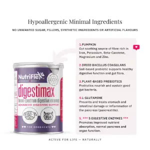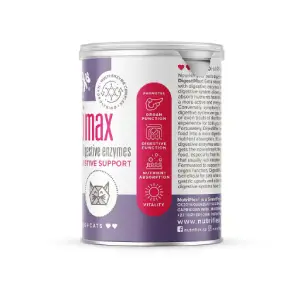 Fortunately, DigestiMax digestive enzymes help to break down food into a more digestible form for better nutrient absorption. By improving nutrient absorption, DigestiMax ensures your pet derives the full nutritional value from their meals, especially from heat-processed foods such as kibble that usually lack enzymes lost in manufacturing.